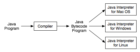 javac)将源代码文件编译成Simple.class文件; - 在任意平台(e.g.Mac, Windows, Linux)上的JVM(java virtual machine)执行