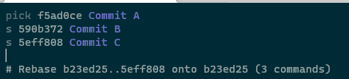 可以看到,我们想压缩的 3 个提交都在 vim 中列了出来,顺序是自顶向下,命令均是 pick,为了压缩它们,我们可以将 pick 命令改为 squash: