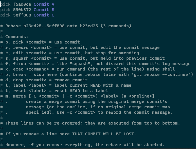 基于交互式 rebase 的方式,将会在默认编辑器中将所有相关的提交列出来。