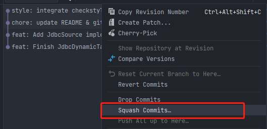 例如,在 IDEA 中,我们可以选择要压缩的提交,然后右键点击 “Squash Commits” 便可完成。