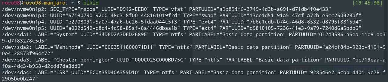 获取相应分区的UUID,以更新fstab文件和/etc/default/grub文件:blkid: