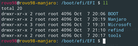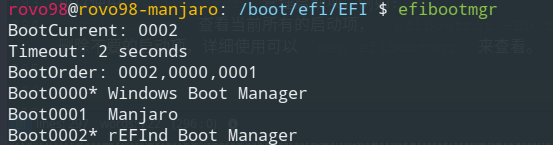 在chroot到目标系统之前,需要挂载EFI分区到/mnt/manjaro/boot/efi(refind管理文件默认位置)下:
