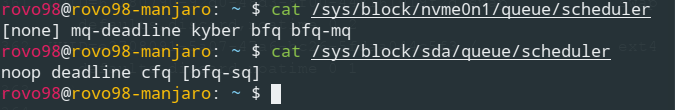 可以看到我当前固态没有使用任何调度器,而机械硬盘使用的是bfq-sq. - 修改IO调度器(临时的):