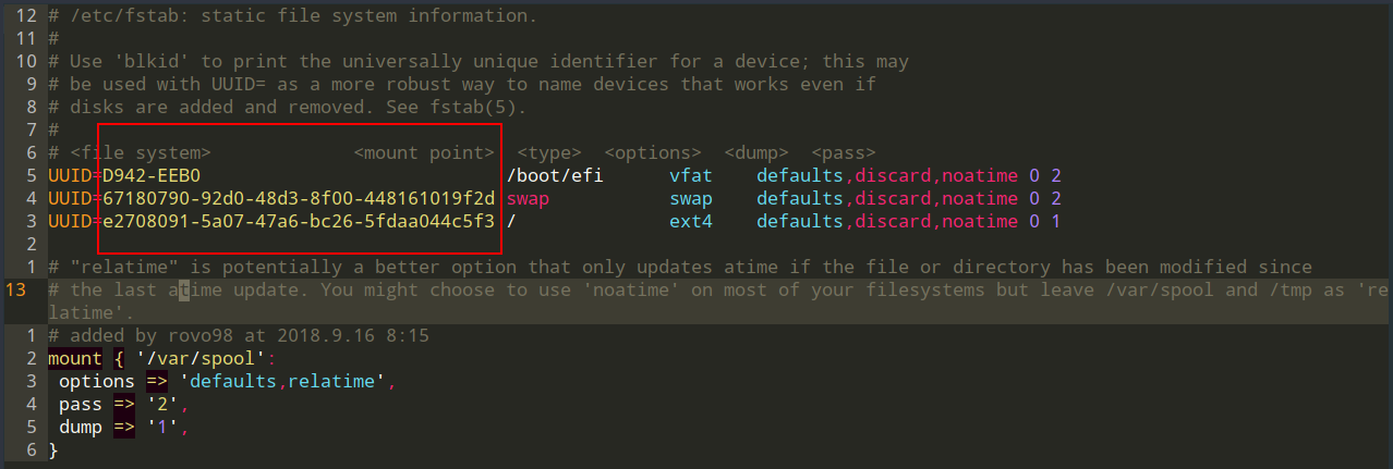 主要修改挂载项以及对应的UUID,有关fstab文件的详细内容可以参考https://wiki.archlinux.org/index.php/Fstab
