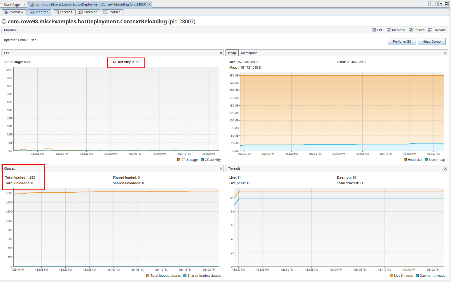 int count = 0; for (;;) { count++; // Using infinite loop to make the thread keep running. String className = "com.rovo98.miscExamples.hotDeployment.ClassReloading$User"; Class<?> target = new MyClassLoader().loadClass(className); // Invokes the method of the loaded class using Reflection System.out.println(count + " round: loading target successfully, ready to invoke the method!"); target.getDeclaredMethod("execute").invoke(target.newInstance());
