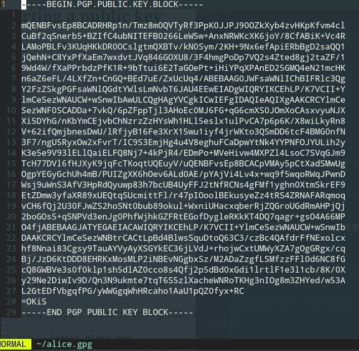 1 | gpg --armor --output alice.gpg --export alice@gmail.com |