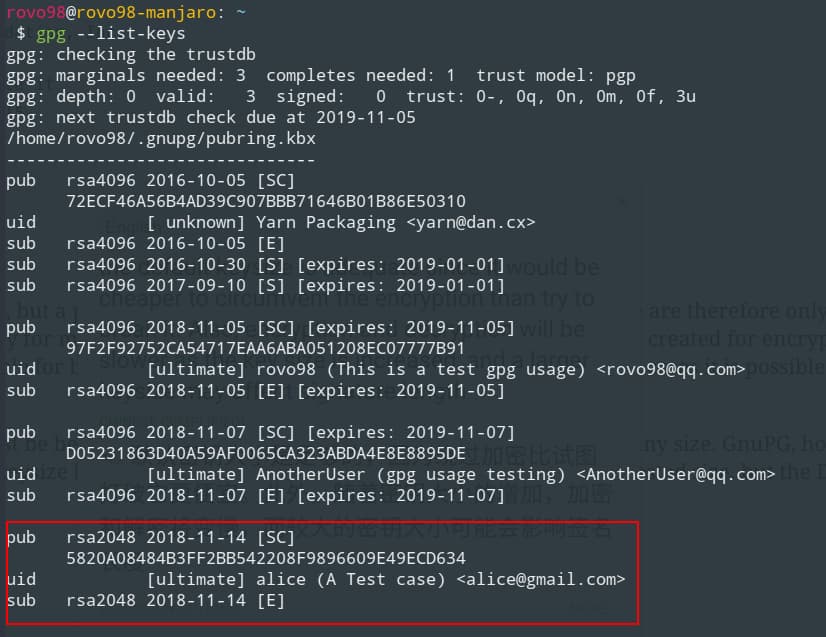 可以使用gpg --list-keys查看当前管理的所有密钥.