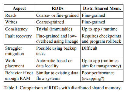 为展示 RDD 模型作为一个分布式内存抽象的优点,文章将其与分布式共享内存 (Distributed shared memory, DSM) 进行了对比,见下表。在 DSM 系统中,应用可在全部地址空间中,对任意位置进行读写。DSM 是一个非常泛化的抽象,但它的泛化性(generality)反而使得我们很难用它实现在商用集群上实现高效的容错方案。