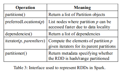 RDDs 的这一通用接口,使得 Spark 能以少于 20 行的代码实现大多数 transformations,即便是 Spark 的新用户也能在不了解调度器(scheduler)细节的情况下,实现新的 transformations。