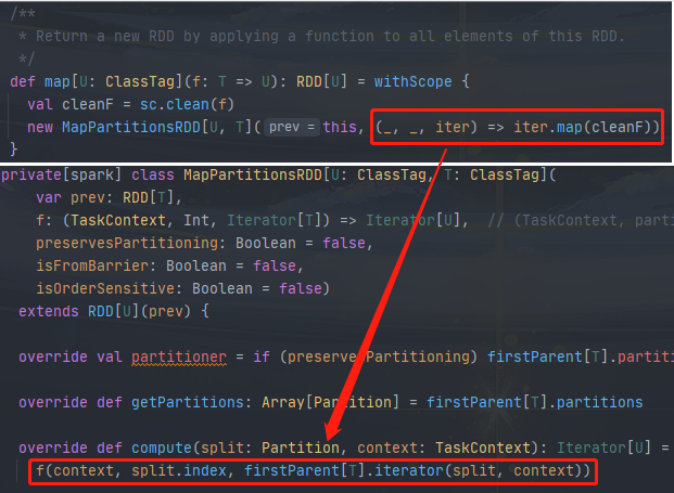 map: 在任意 RDD 上调用 map 方法,会返回一个 MappedRDD 对象。该对象的分区及首选位置(preferred locations)与其父 RDD 一样,但会在 iterator 方法中对其父 RDD 的数据执行传入给 map 的函数。