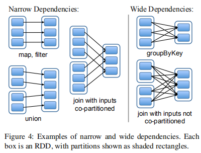另外,值得一提的是,该接口用于表示 RDDs 间依赖关系的设计是一个非常有趣的问题,它将依赖划分成了窄依赖(narrow dependencies)以及宽依赖(wide dependencies)。其中,窄依赖指一个父 RDD 的每一个分区只能被其子 RDD 的某一个分区所使用,而对于宽依赖,则多个子 RDD 分区可依赖于同一个父 RDD 分区。常见地,map, filter, union 都是窄依赖,而 join 则是宽依赖(父 RDD 没有进行 hash 分区的情况下)。将依赖进行这样划分的原因主要有两: