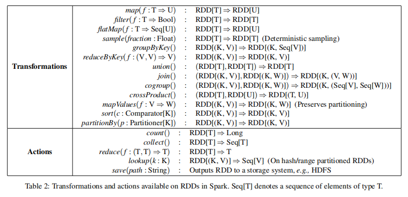 一个 RDD 是一个只读的,分区的数据集,且所有 RDD 仅能从某稳定的数据存储上的数据及其他 RDDs 上执行特定操作来进行创建。为与 RDD 的其他操作区分开来,这些特定操作被称为 transformations (转换算子),e.g. map, filter, join。需要特别指出的是,RDDs 不需要时刻保持具体化(materialized),因为 RDD 拥有足够多的信息关于它从何而来(通过其血缘 lineage)以及如何找到需要计算的数据,包括计算方式。这是 RDD 拥有的一个非常强大的属性,此外,用户还能对 RDD 的持久化和分区方式进行控制,指示 RDD 是否需要被重用,并指定其存储策略。