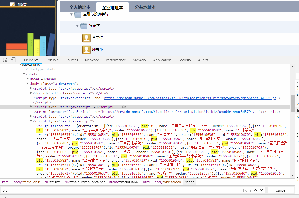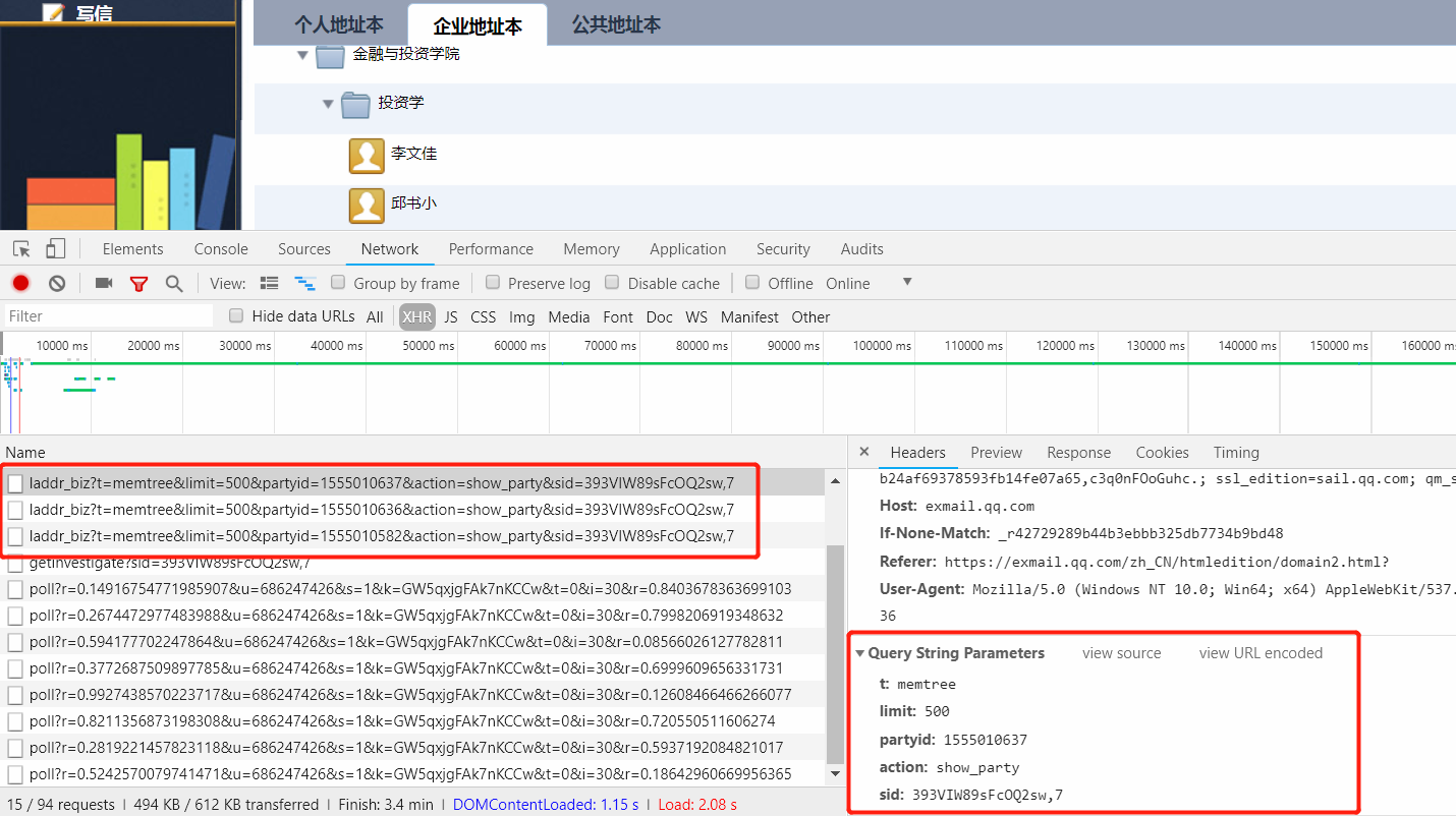 可以看到,请求链接格式为:https://exmail.qq.com/cgi-bin/laddr_biz?t=memtree&limit={limit}&partyid={pid}&action=show_party&sid={sid},参数有 -