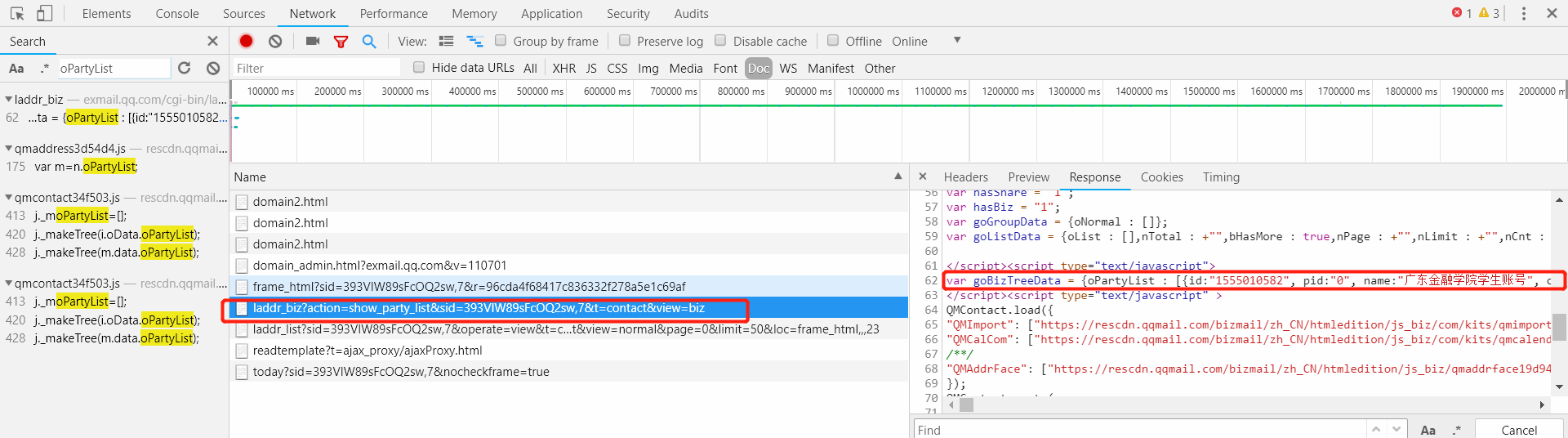 继续在Network中将过滤类型设置为doc同时按文件大小排序,查找包含oPartyList的文件 -